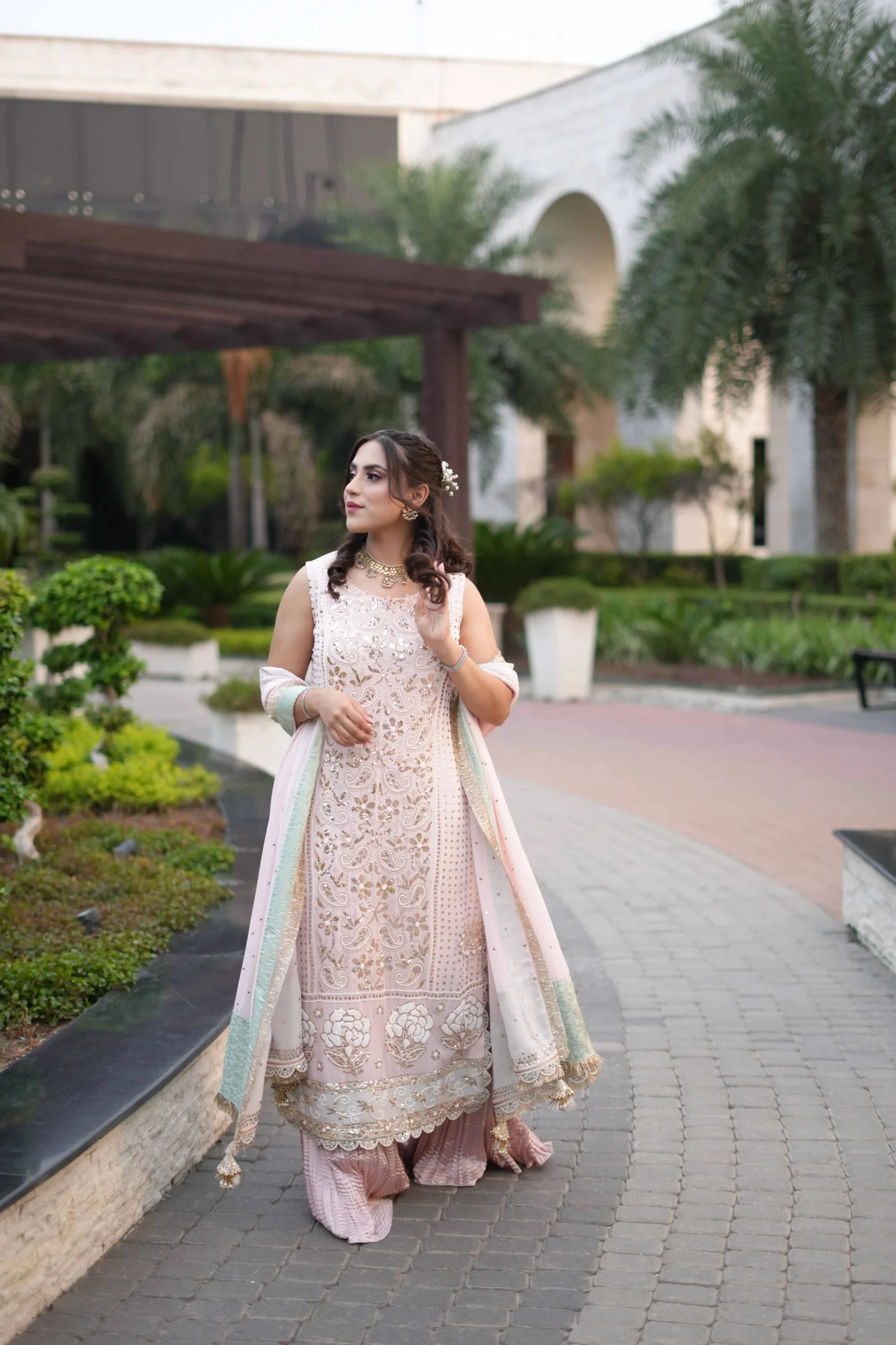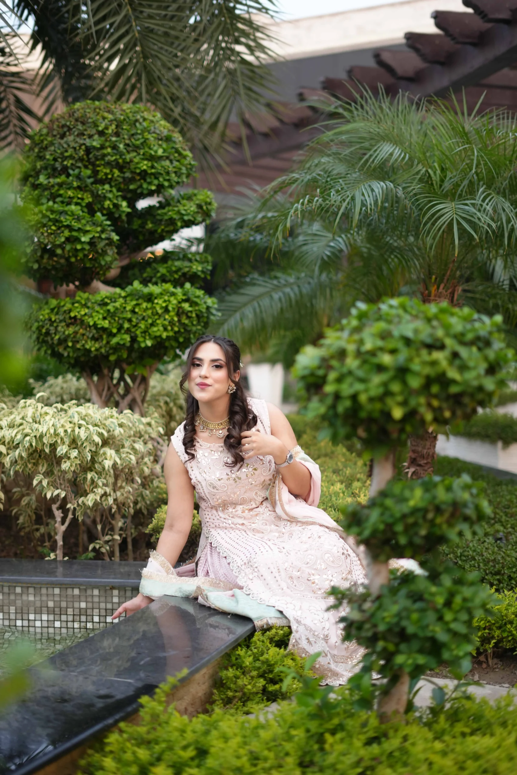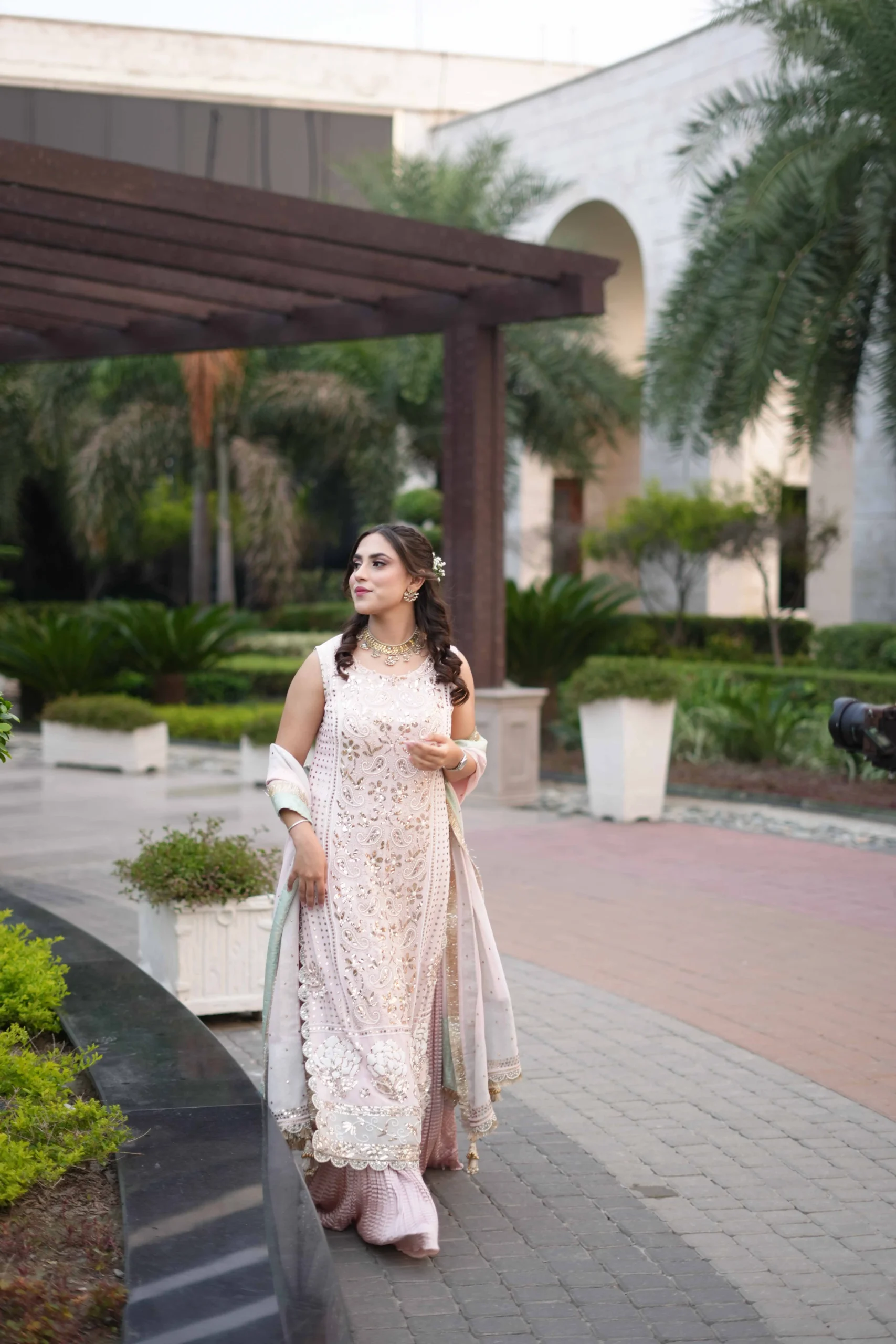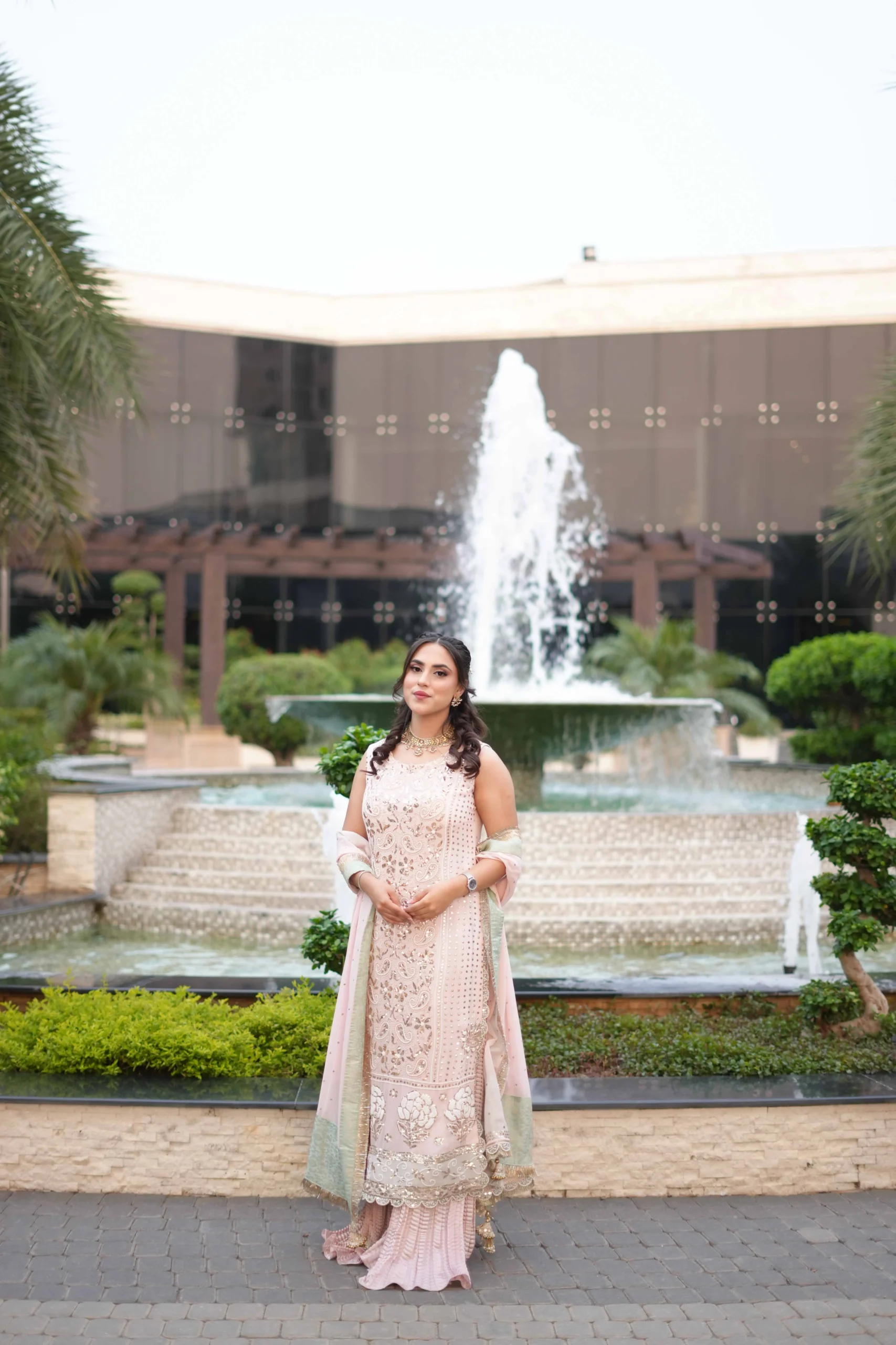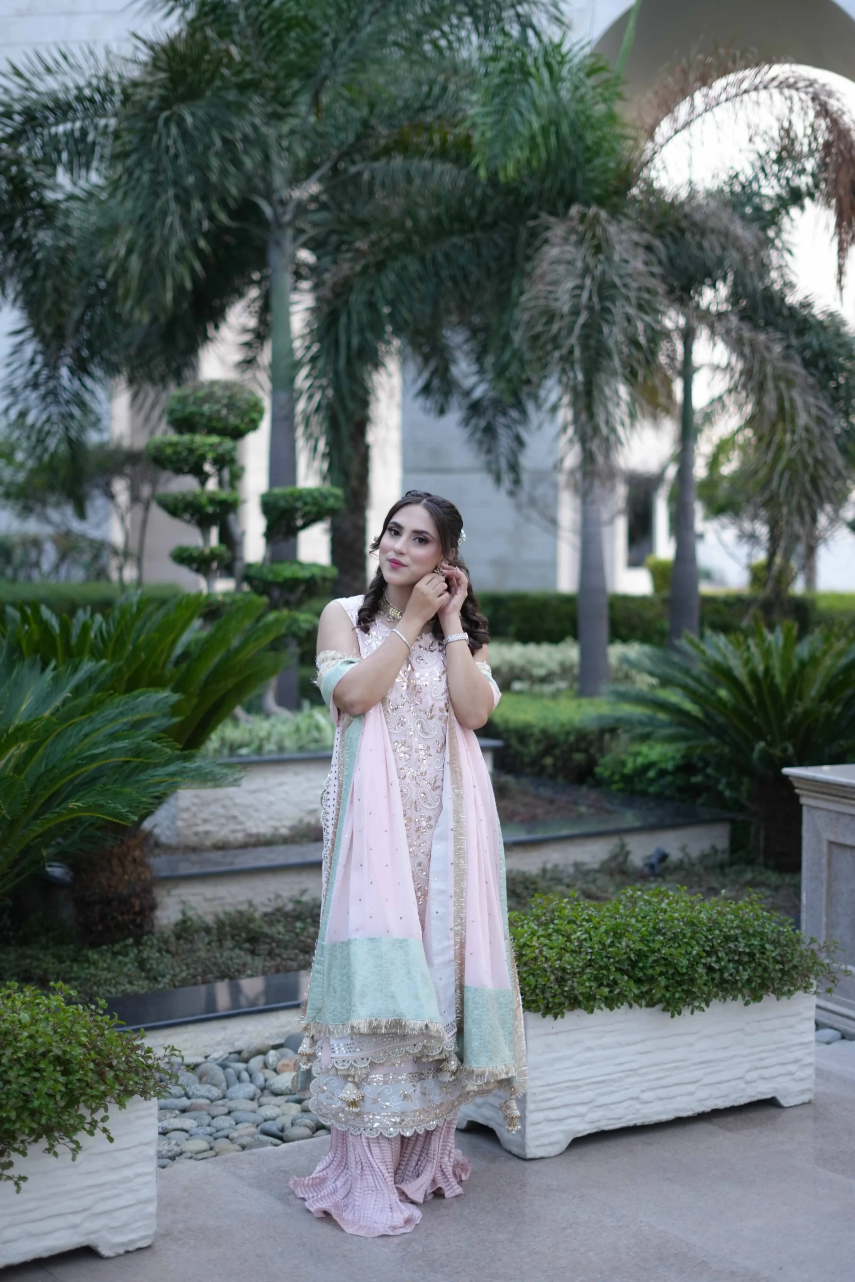 Bridal outfit tells a whimsical tale with its floral abstract theme, beautifully captured in the design of the dupatta and lehenga. Each piece is adorned with handcrafted embellishments that add a touch of elegance and luxury to the ensemble, making it a truly memorable choice for any bride.
