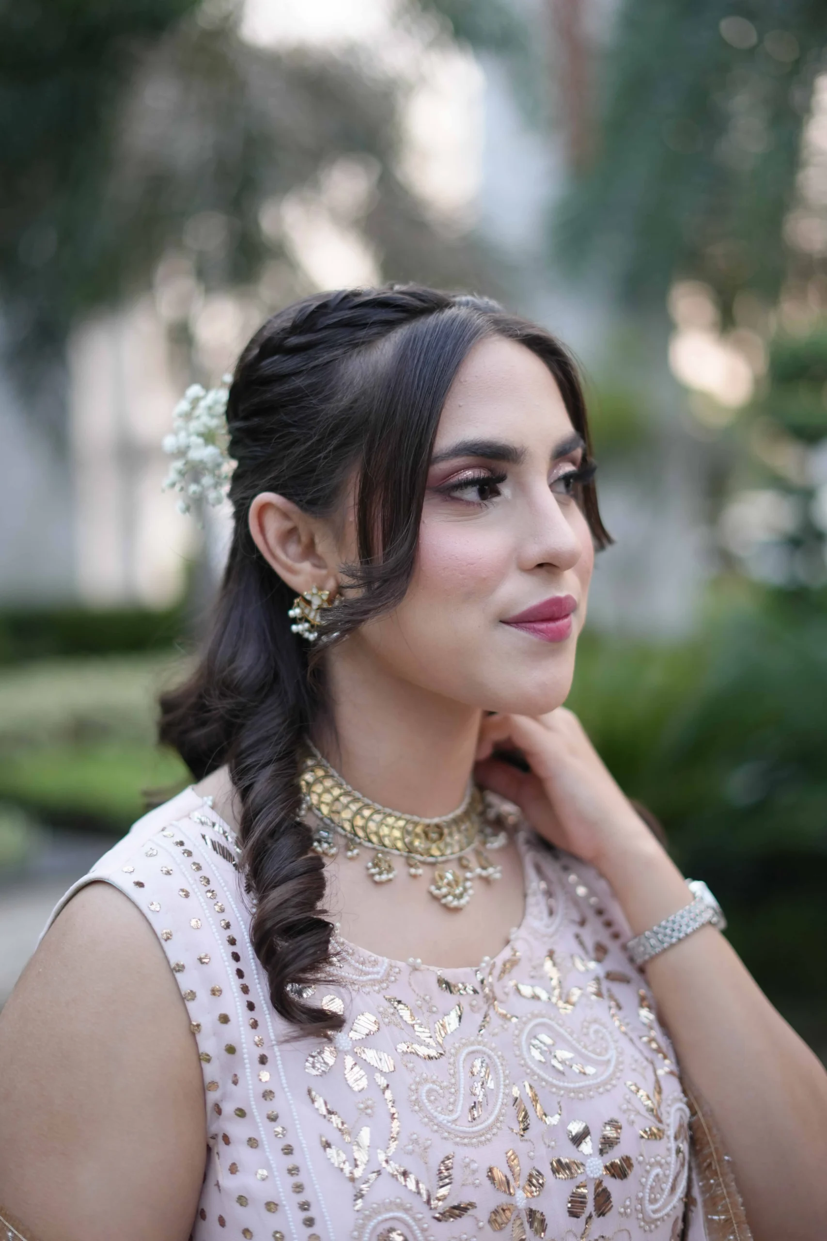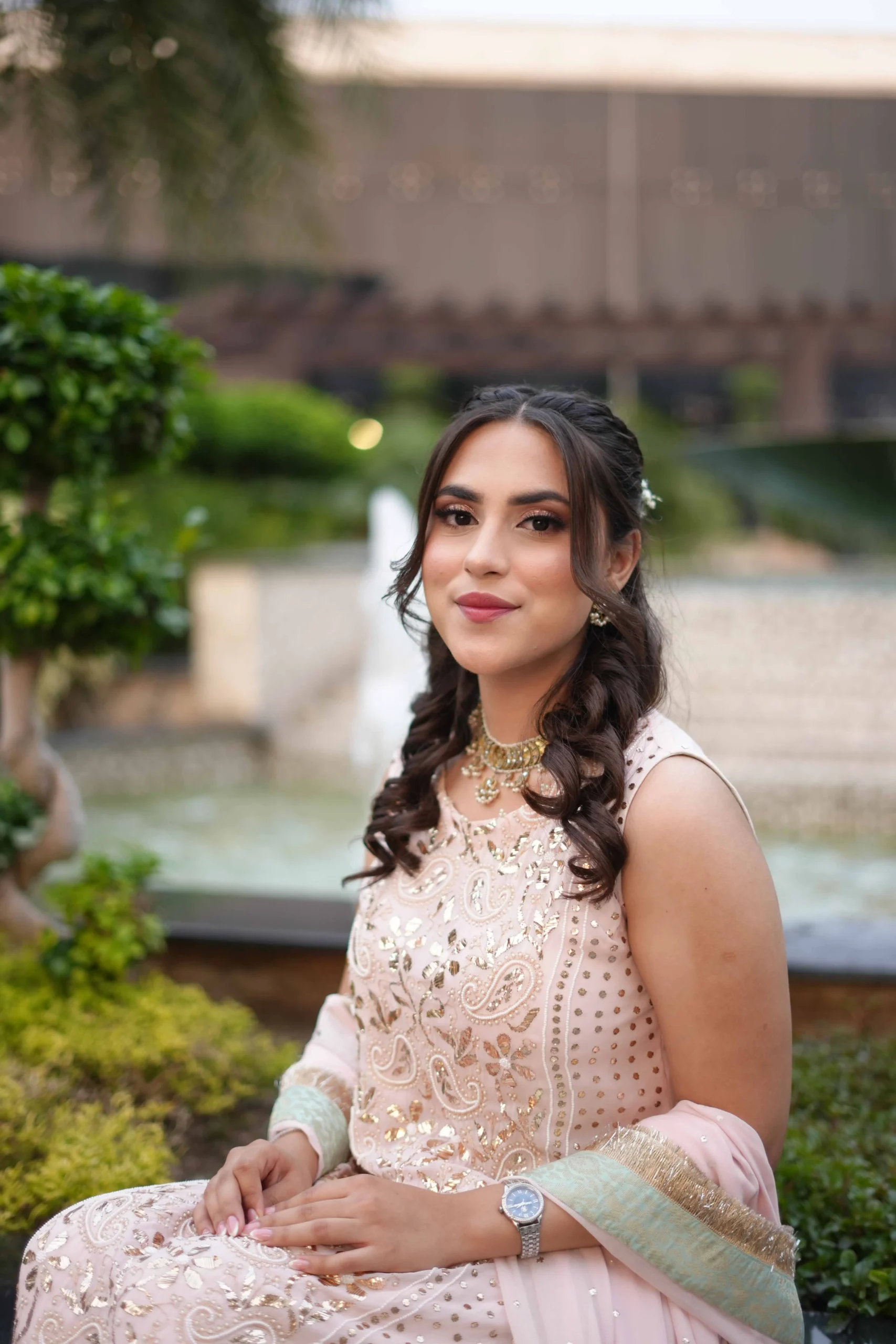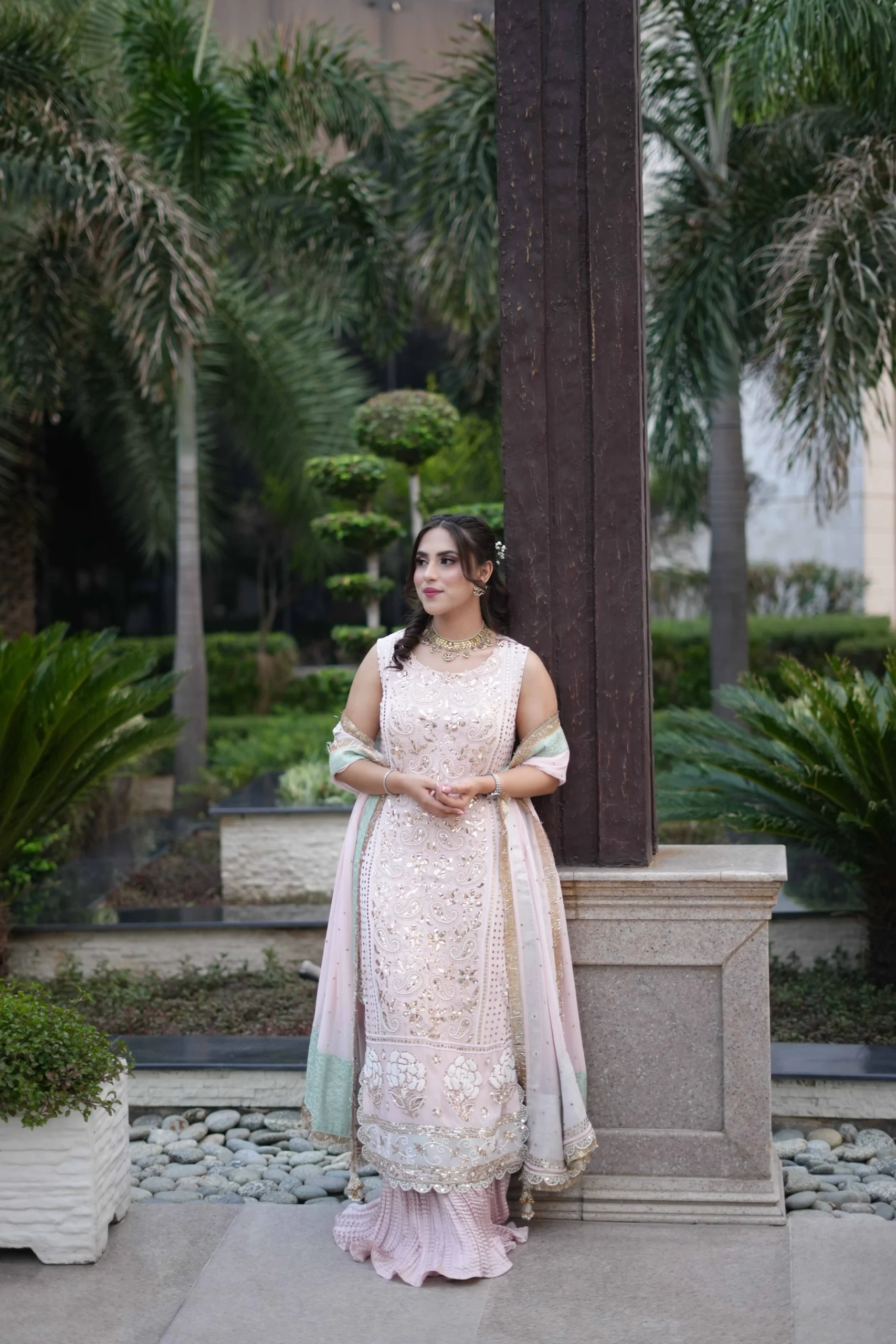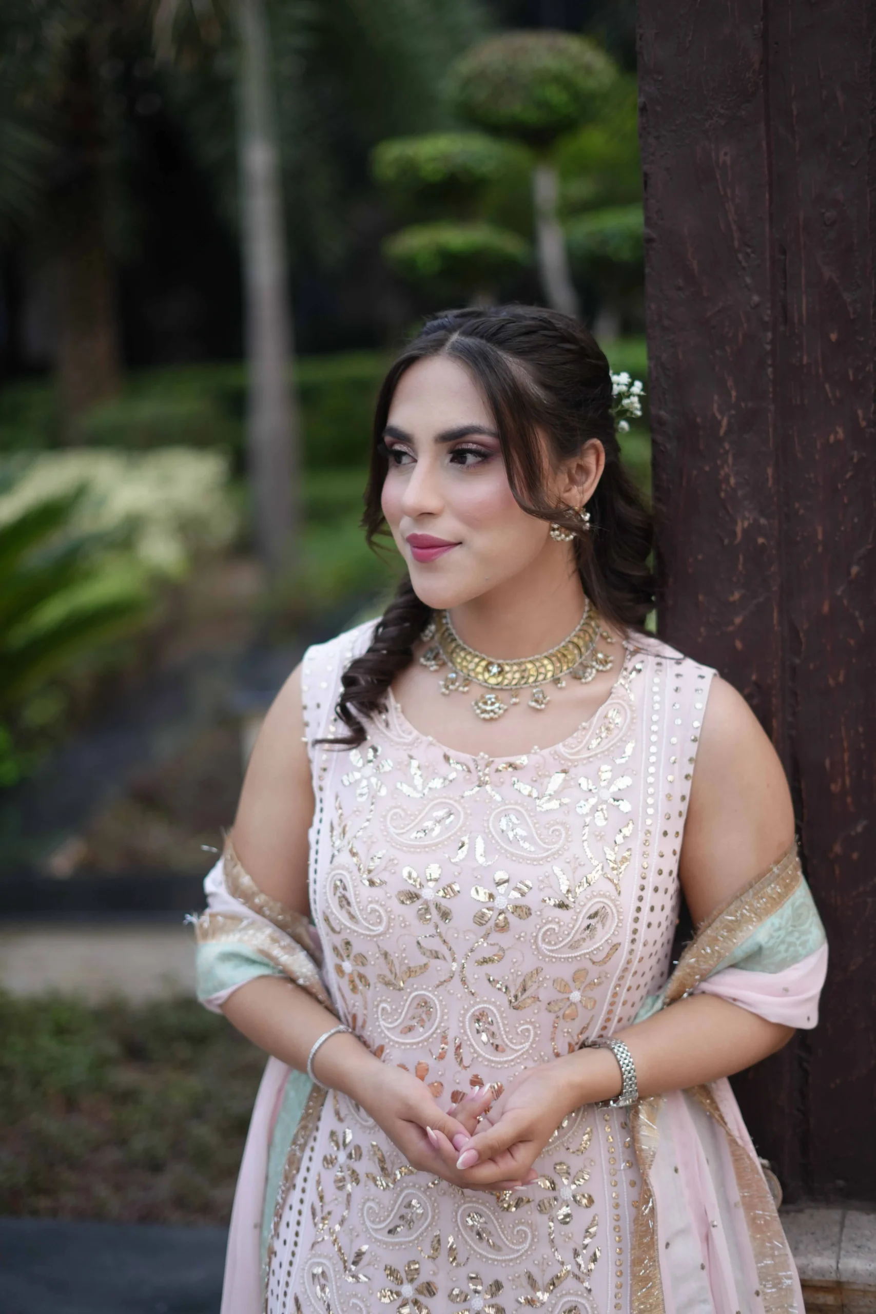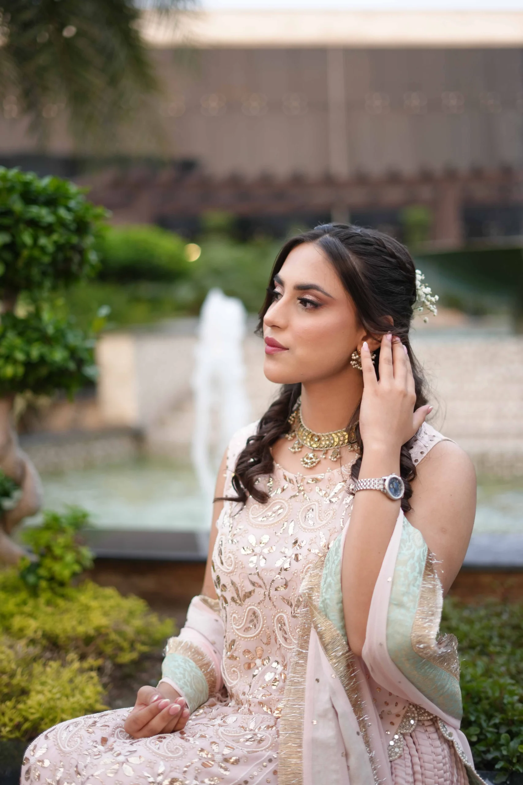 Bridal outfit tells a whimsical tale with its floral abstract theme, beautifully captured in the design of the dupatta and lehenga. Each piece is adorned with handcrafted embellishments that add a touch of elegance and luxury to the ensemble, making it a truly memorable choice for any bride.