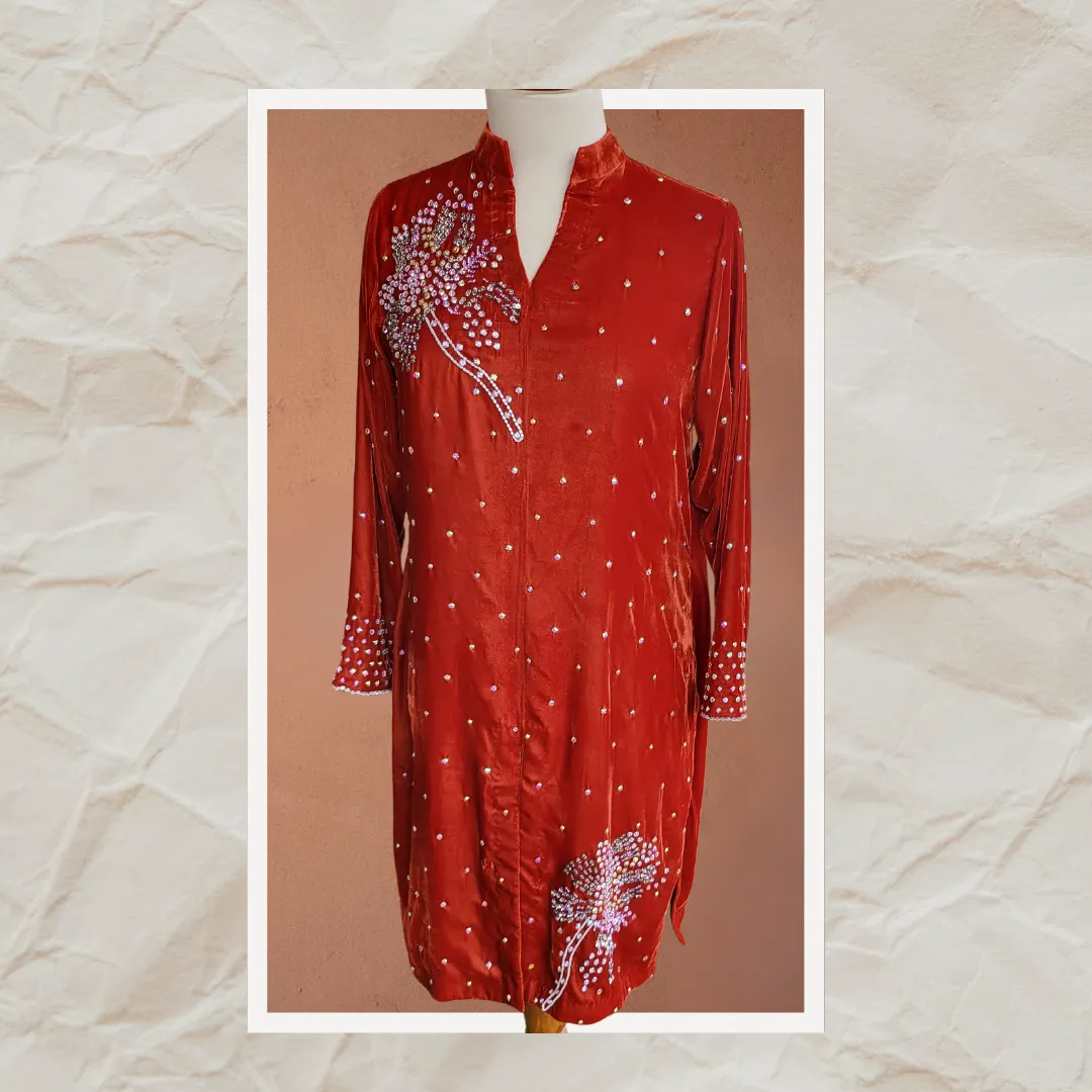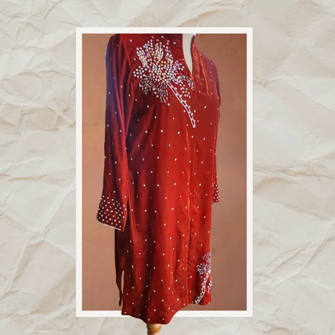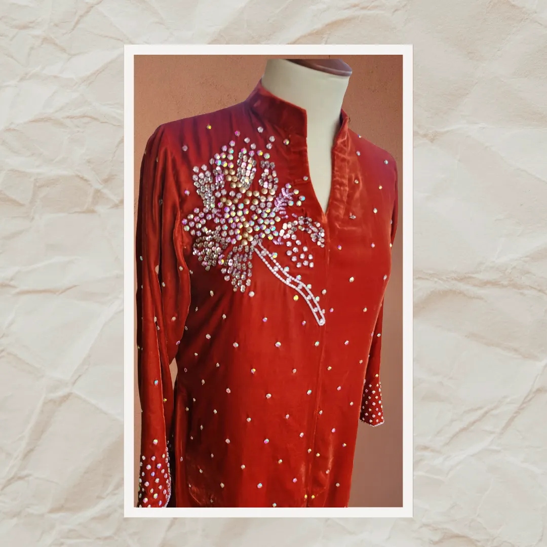 Elegance is beauty, and this velvet dress is the epitome of it. Crafted from pure French velvet, the shirt sparkles with intricate Swarovski crystals and sequins, showcasing the artistry of our talented craftsmen. Paired with sleek raw silk pants, this ensemble is a timeless statement of sophistication and grace.