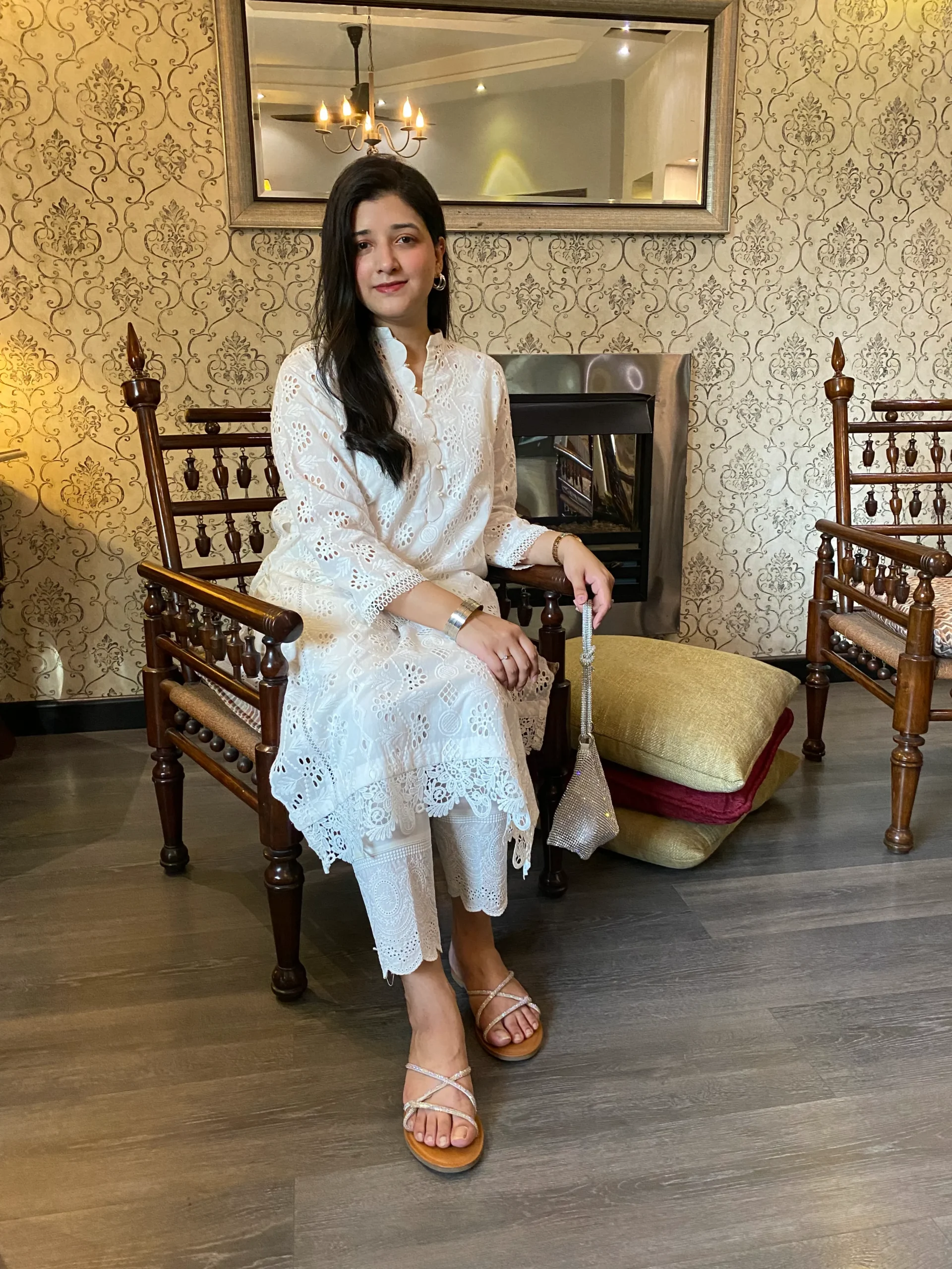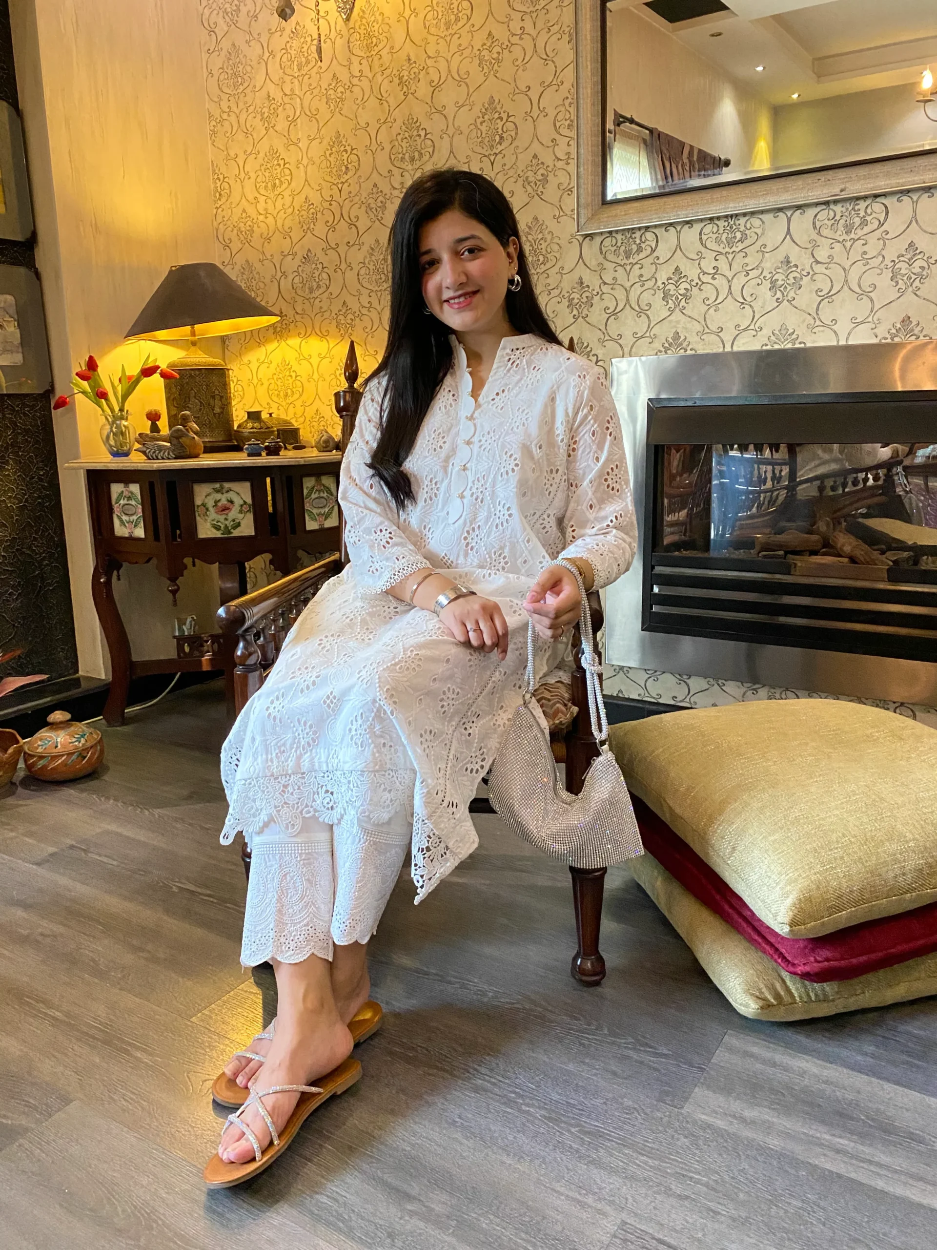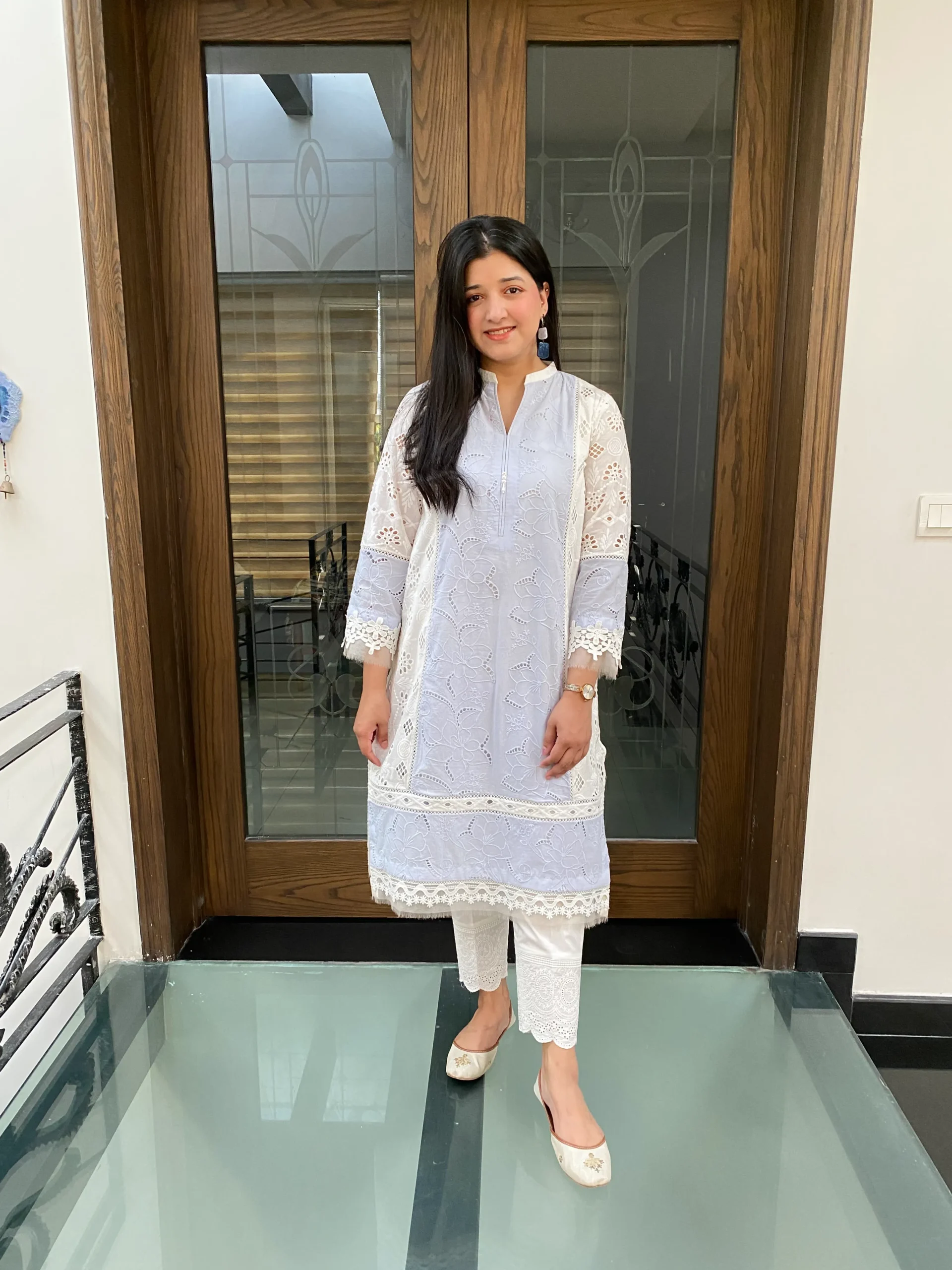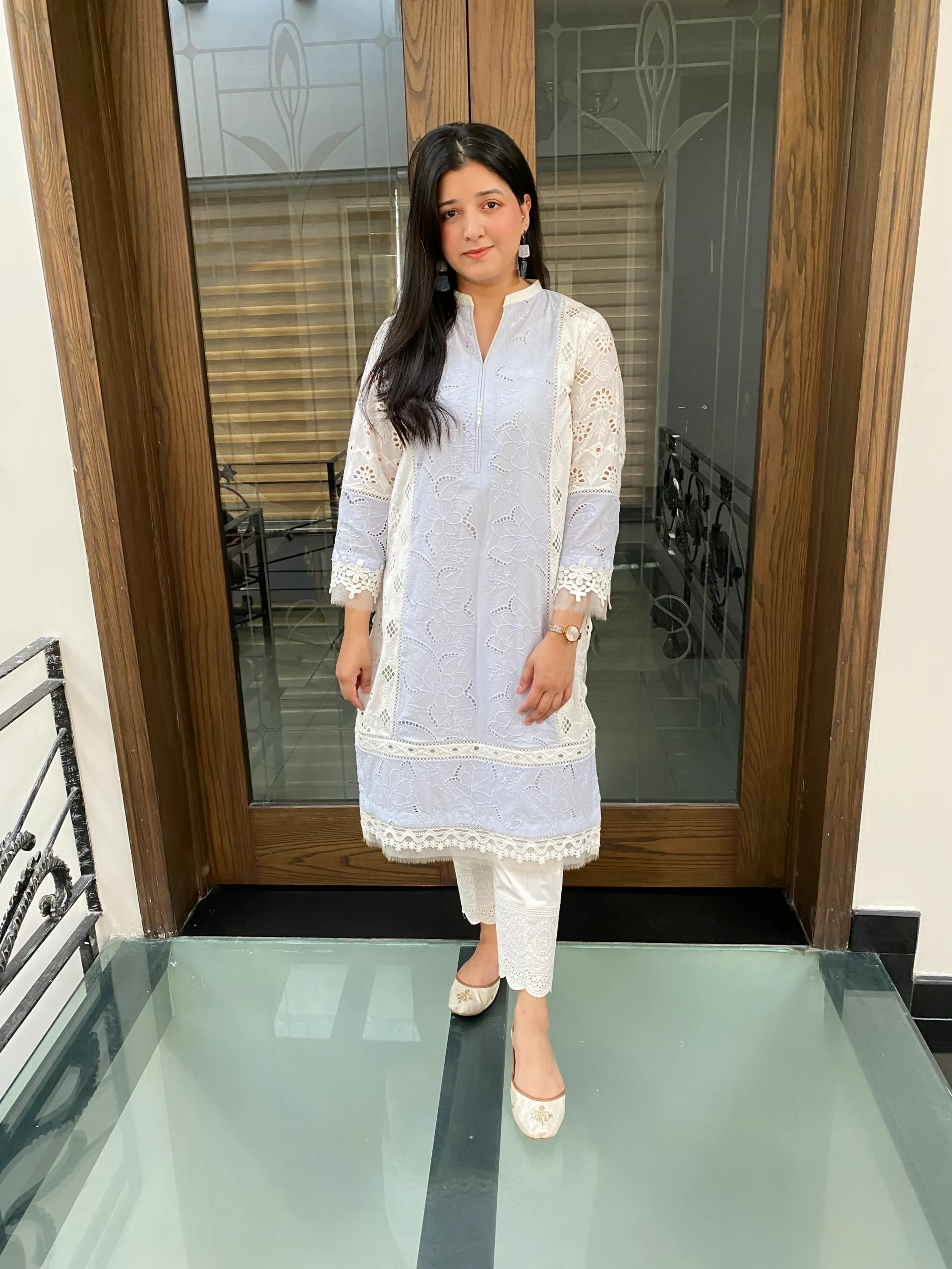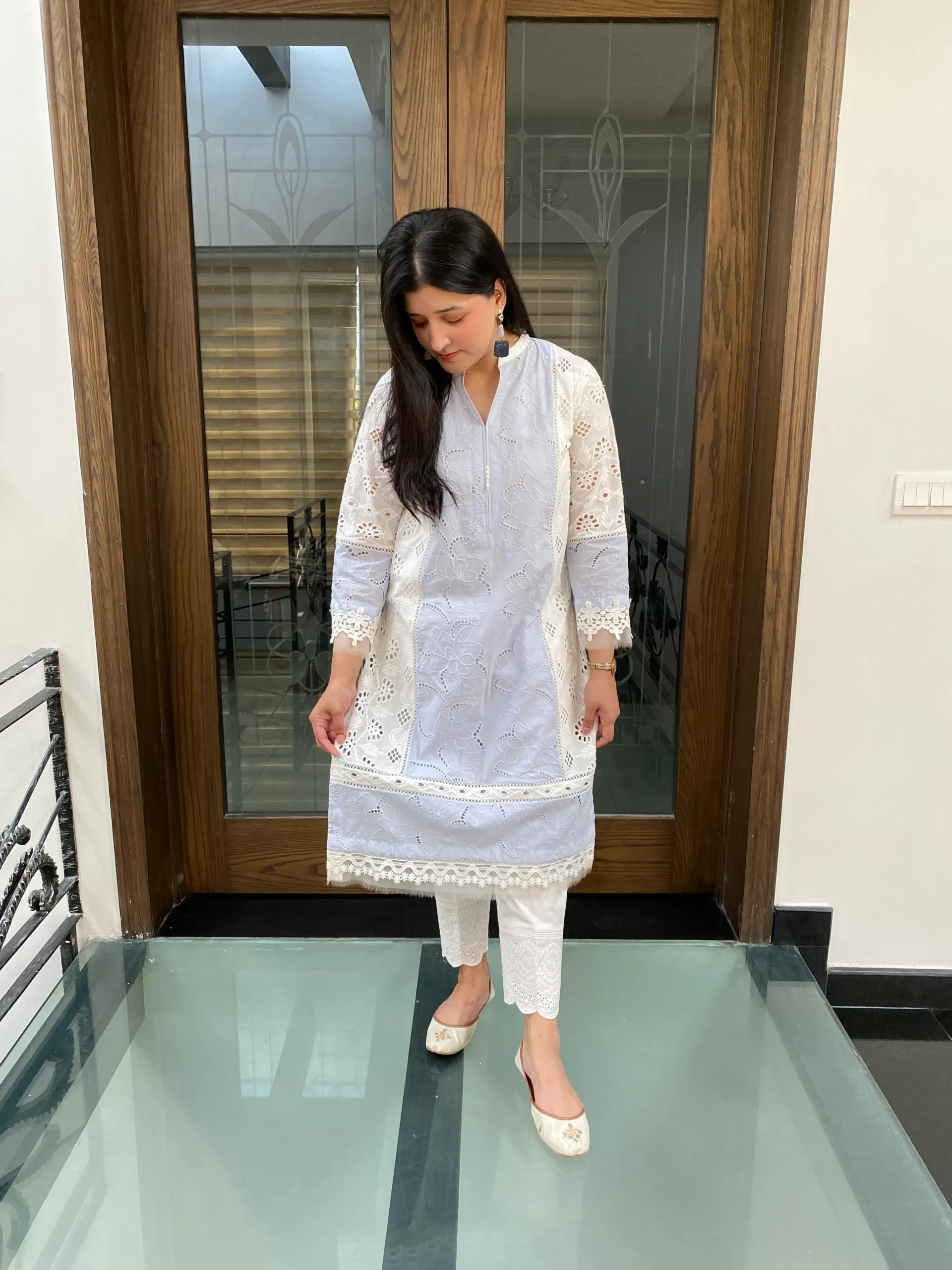 Elegant chikankari shirt with delicate cutwork side panels, paired with a pants, Features intricate lace detailing for a refined look whuh is offering a modern twist.