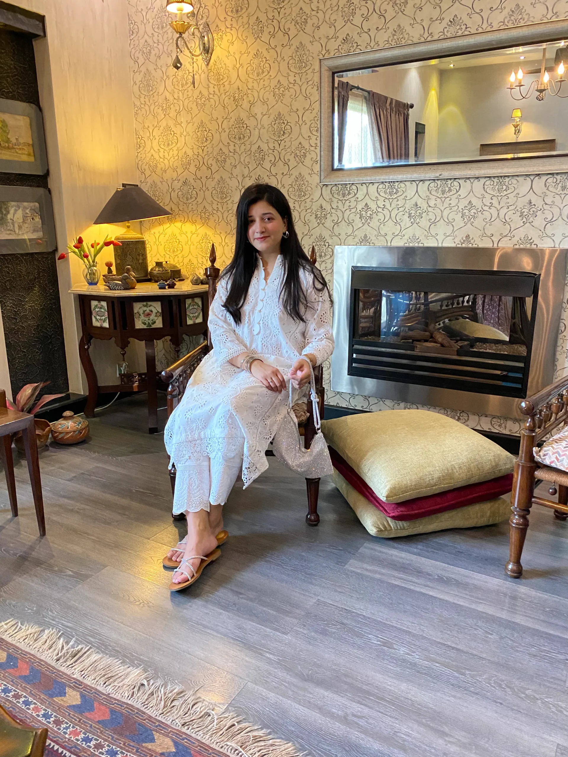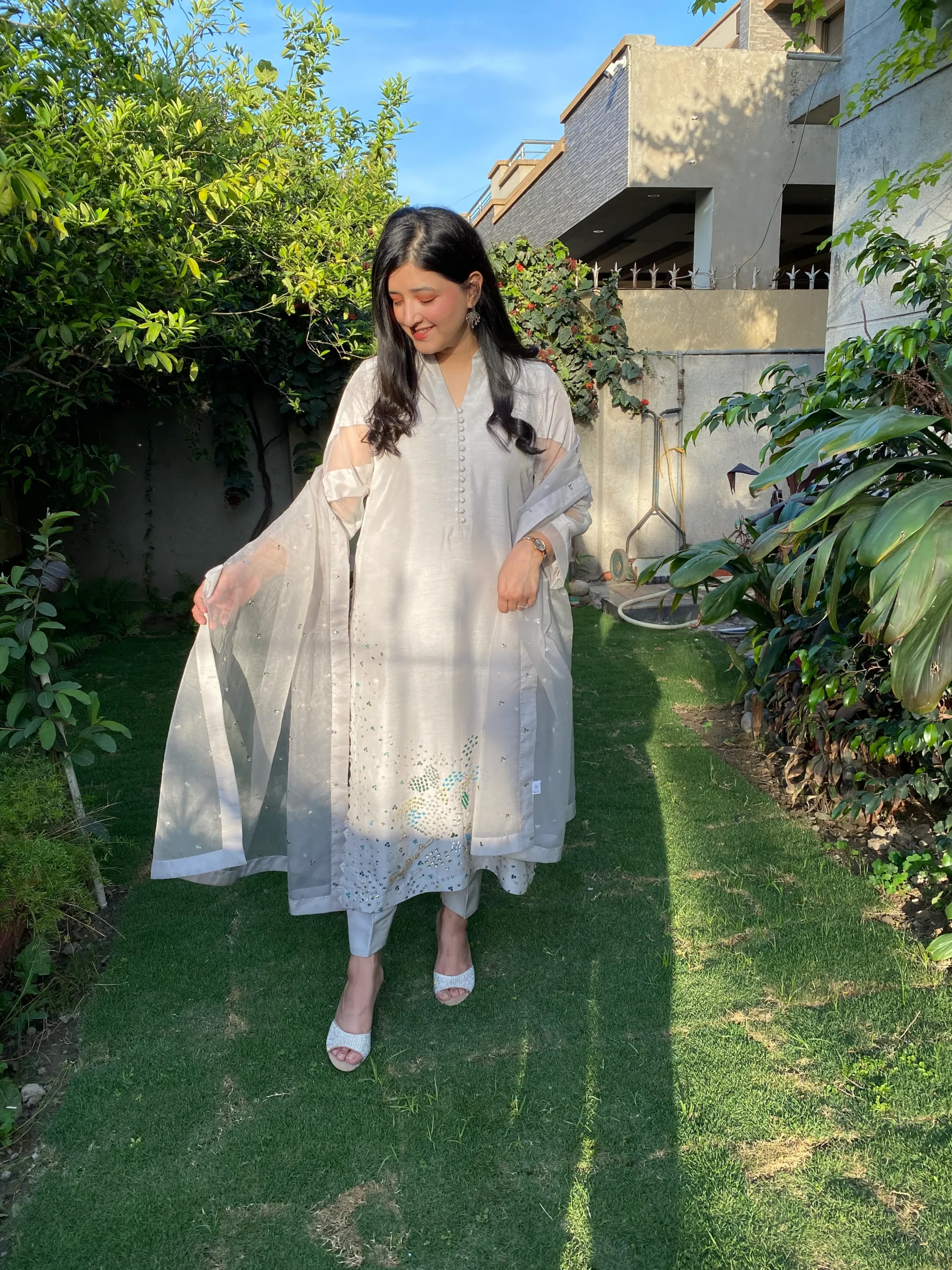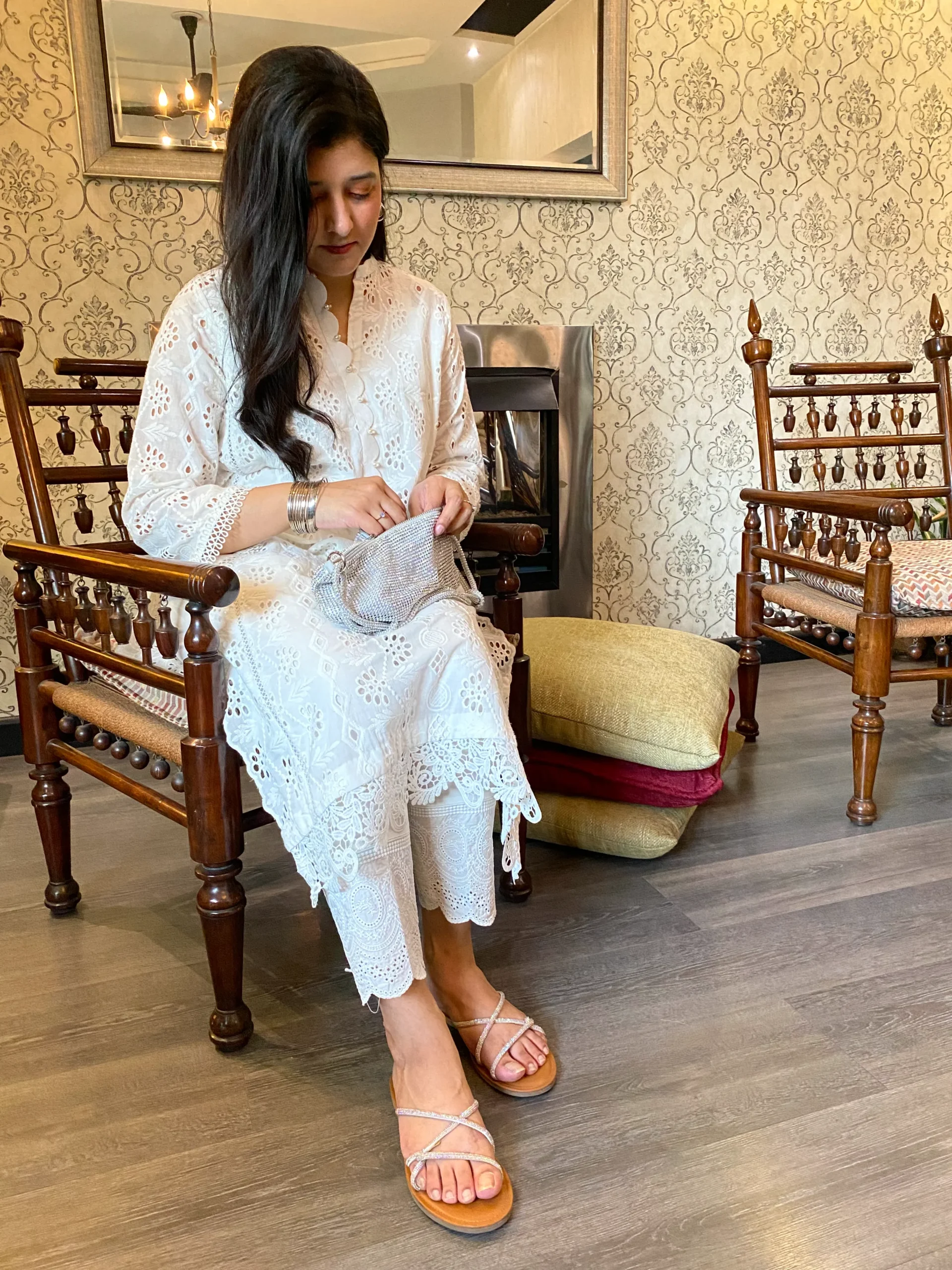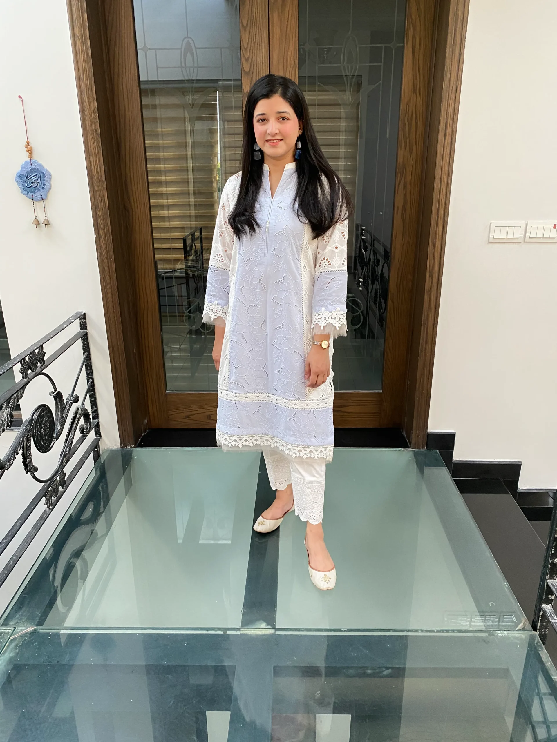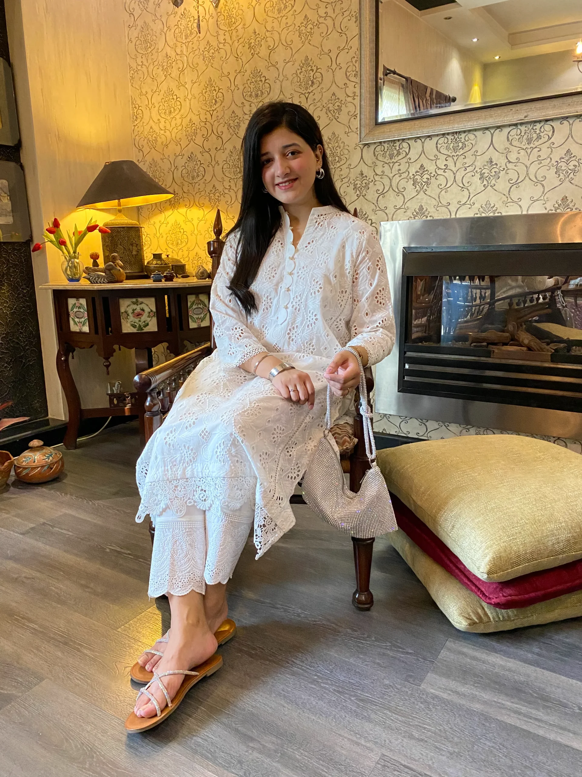 Elegant chikankari shirt with delicate cutwork side panels, paired with a pants, Features intricate lace detailing for a refined look whuh is offering a modern twist.
